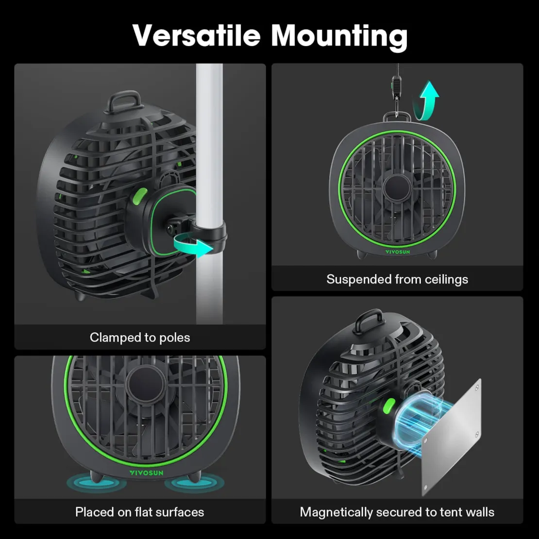 Vielseitige Montage: Dieser leichte Ventilator bietet vier Montagemöglichkeiten für eine flexible Platzierung. Er kann auf flachen Oberflächen positioniert, an Stangen geklemmt, von Decken aufgehängt oder magnetisch an Zeltwänden befestigt werden, indem eine separate Eisenplatte (nicht im Lieferumfang enthalten) auf der entsprechenden Außenseite positioniert wird.
