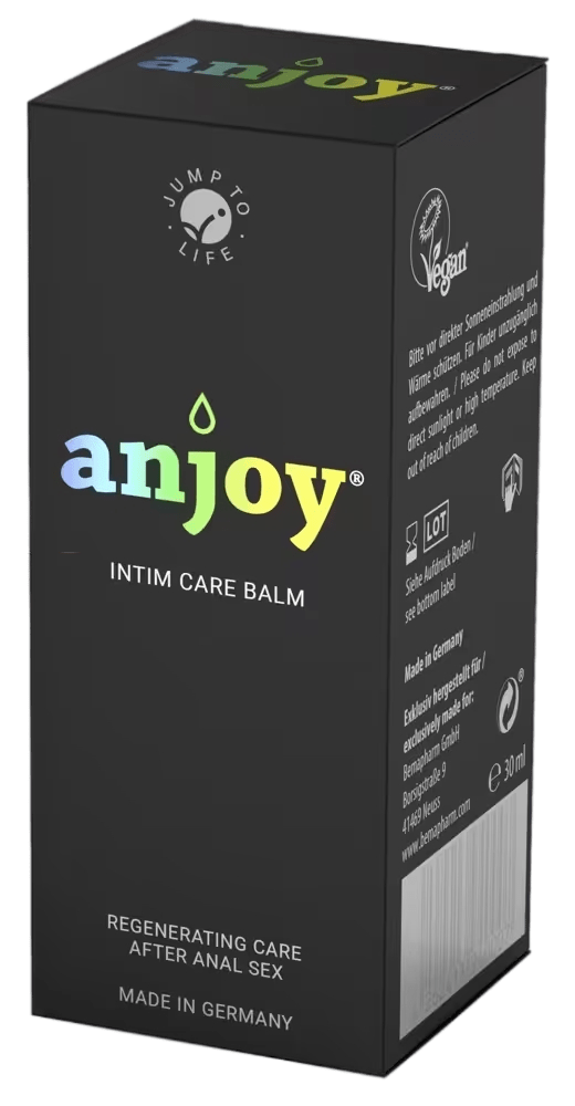 Speziell für die gereizte und beanspruchte Haut nach dem Analsex entwickelt, bringt der „anjoy“ Intim-Care-Balm Deine Intimhaut wieder ins Gleichgewicht und eignet sich überdies hinaus auch als optimalen Hautschutz vor dem Sex. Die Formel enthält ausschließlich 100 % natürliche Inhaltsstoffe und setzt sich aus besonders hochwertigen Ölen, die sorgfältig durch Kaltölauszug gewonnen wurden, sowie aus pflanzlichen Komponenten und reinem Vitamin E (D-alpha-Tocopherol) zusammen. Der „anjoy“ Balsam ist außerdem frei von synthetischen Duft- und Farbstoffen und eignet sich für den täglichen Gebrauch.