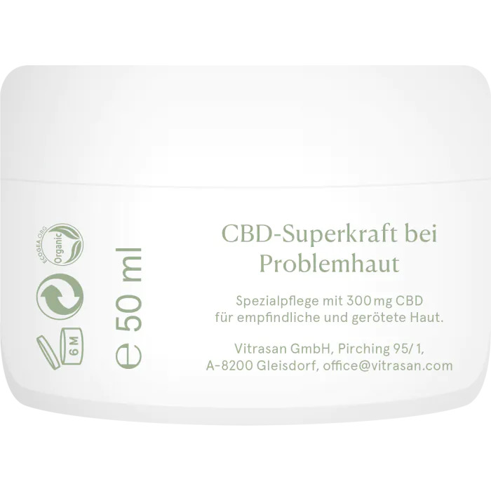 Der Hersteller Vitrasan und seine große Auswahl an verschiedenen Bio-Kosmetik Produkten, kommen aus Österreich. Jedem Artikel merkt man die Sorgfalt und hohe österreichische Qualität an. Die in Nachtkerzen- und Hanfsamenöl enthaltene Gamma-Linolensäure, trägt zu einer besseren Widerstandsfähigkeit Ihrer Haut bei. Der CBD Vital Akutbalsam ist in einem 50ml Kunststofftiegel und enthält 300mg Cannabidiol (CBD).
