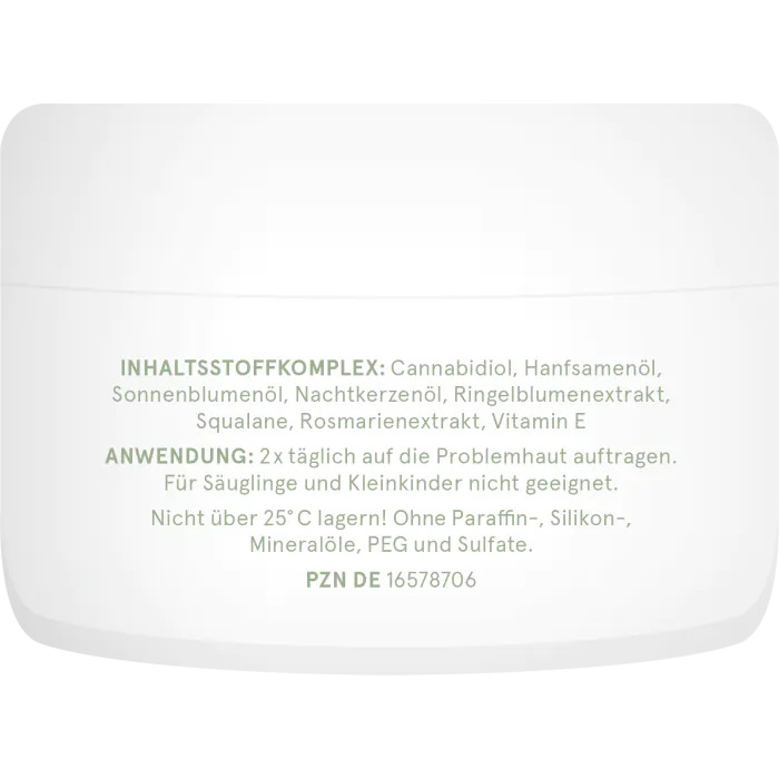 Inhaltsstoffe: Cannabidiol (CBD), Hanfsamenöl, Sonnenblumenöl, Nachtkerzenöl, Ringelblumenextrakt, Squalane, Rosmarinextrakt, Vitamin E