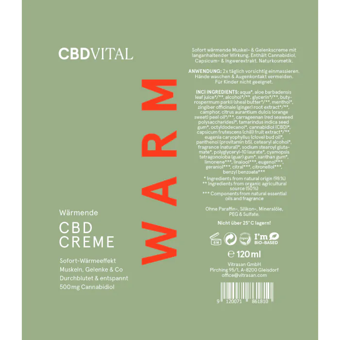 Das Arthro Warm ist ein Bio-Kosmetikprodukt und ist frei von Paraffinölen, Silikonen oder Mineralölen. Es enthält keine Sulfate oder Parabene. Durch die natürlichen Inhaltsstoffe wie Orangenöl, Ingwerextrakt und Aloe Vera, ist es für Veganer geeignet. Durch das enthaltene Dexpanthenol ist es besonders gut verträglich und fördert die Selbstheilung des Körpers. Die wärmende CBD Salbe von Vitrasan ist 100% organisch und einen THC Gehalt von 0,0%.
