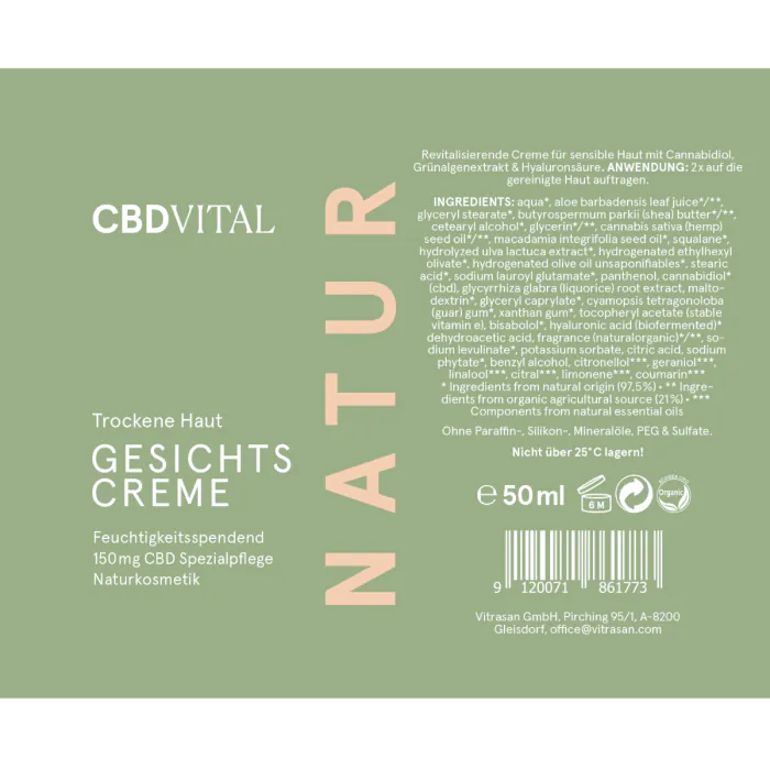 Die genaue und präzise Abstimmung der Inhaltsstoffe in der CBD Bio-Kosmetik von Vitrasan, sorgt insgesamt für mehr Elastizität und Spannkraft, sowie für gestrafftere Gesichtskonturen und natürlich für ein ebenmäßiges Hautbild. Zudem stärkt das enthaltene CBD die Kollagenfasern der Gesichtshaut und soll sogar das Bindegewebe verbessern können. Die feuchtigkeitsspendende und revitalisierende Gesichtscreme von Vitrasan enthält neben dem CBD auch noch Aloe Vera, Dexpanthenol und Süßholzwurzel. Diese Bio-Kosmetik ist ohne Paraffinöle, Silikone oder Mineralöle und ist auch für Veganer geeignet.