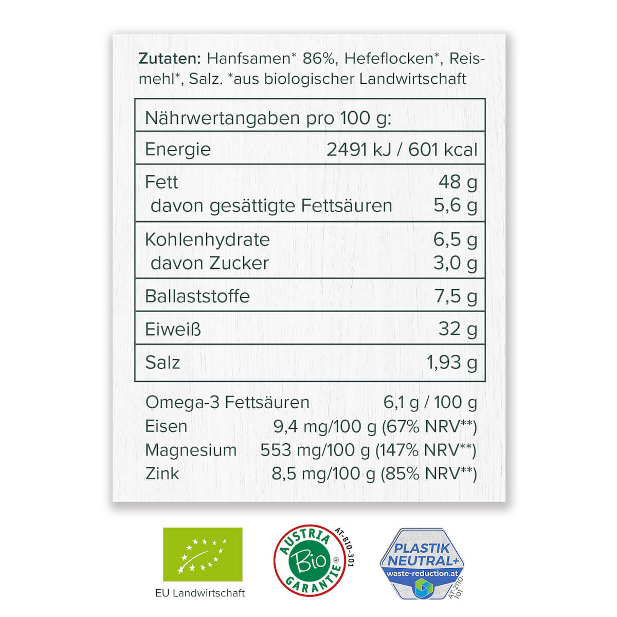 - Zutaten: Hanfsamen* (80%), Hefeflocken*, Reismehl*, Salz (*aus kontrolliert biologischem Anbau)