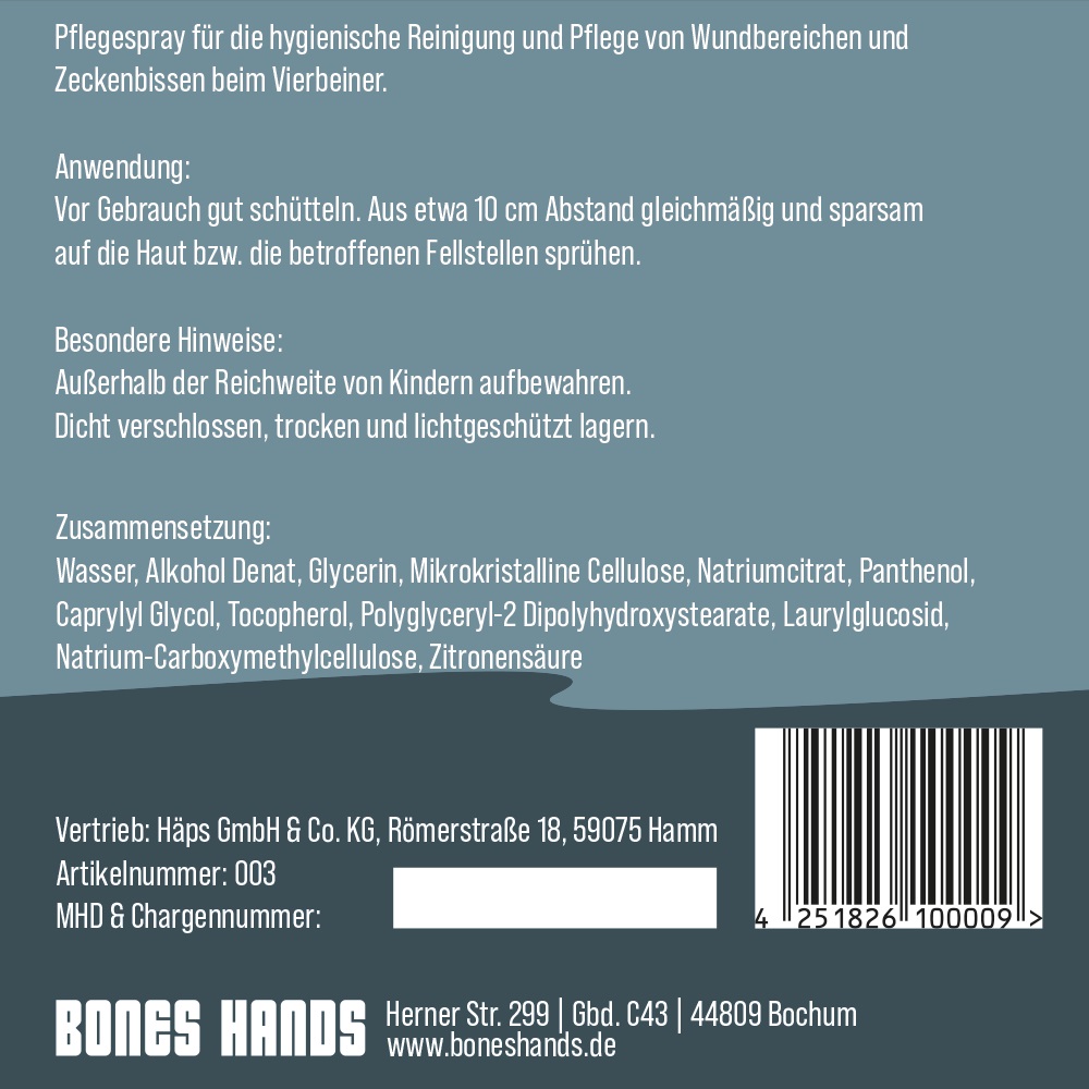 Dieses Spray eignet sich ideal zur schonenden Reinigung und Pflege von Wunden und Zeckenbissen bei Hunden und anderen Haustieren. Es fördert die Regeneration und pflegt die Haut Ihres Vierbeiners bei Beschwerden wie: