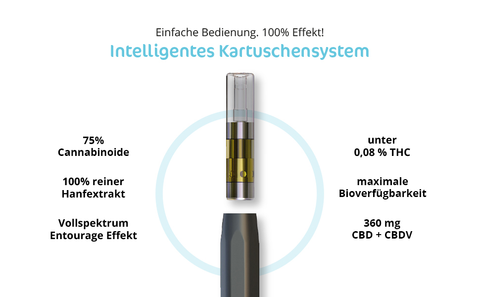 Inhatsstoffe: Hanfextrakt (75% Cannabinoide, -360 mg CBD+ CBDV). Der Inhalt der Kartusche ist vegan.