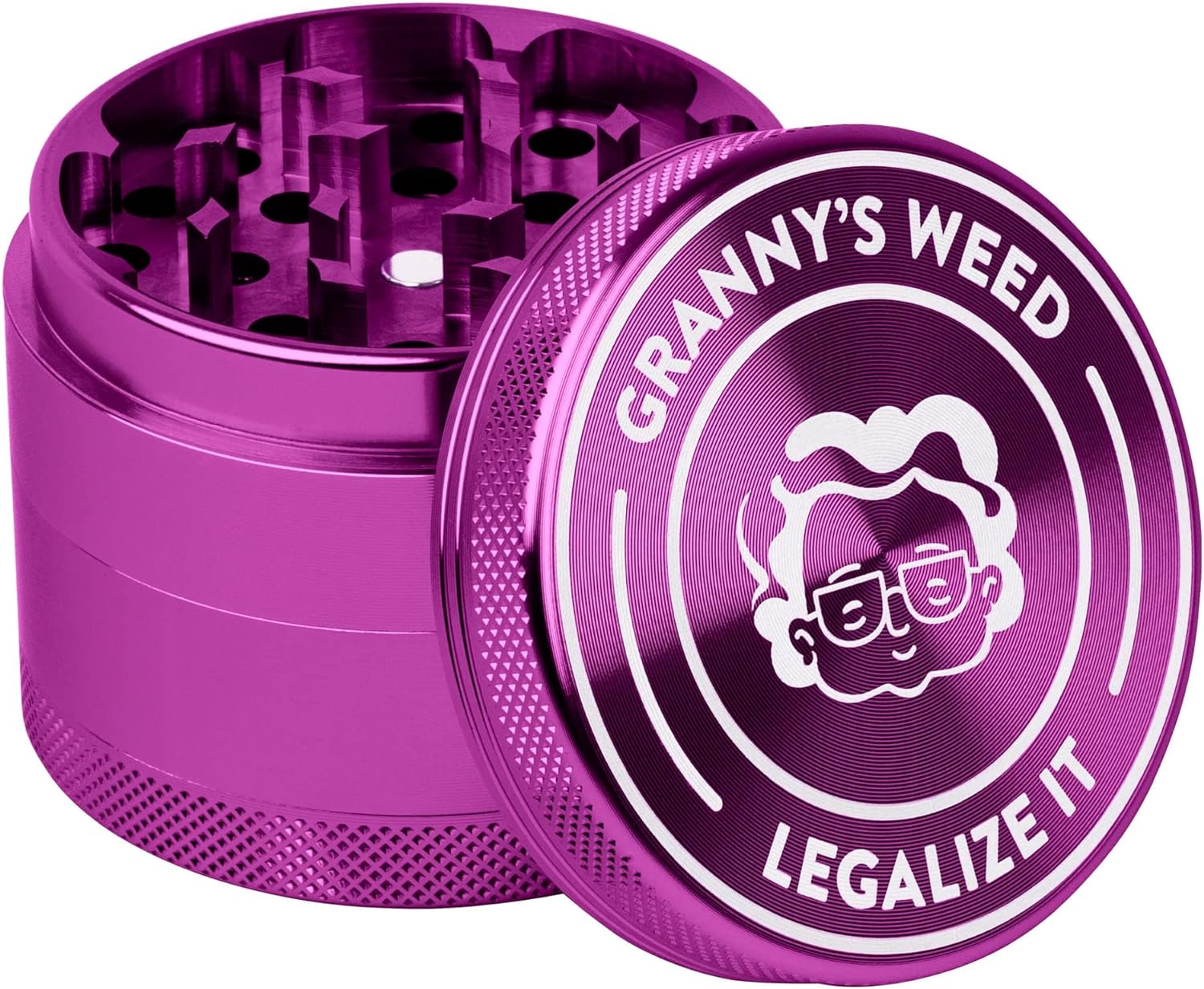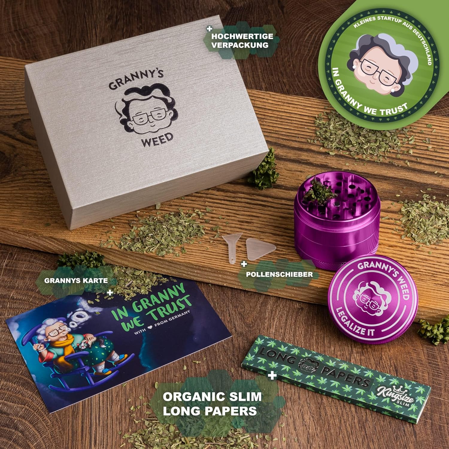 "Erlebe erstklassige Qualität mit Granny's Premium Aluminium Grinder: Ein messerscharfes Mahlwerk für ein perfektes Grind-Erlebnis. Mit einem Durchmesser von 5,5 cm und 4-teiligem Design, inklusive praktischem Pollenschieber. Verfügbar in edlem Gold und weiteren ansprechenden Designs."