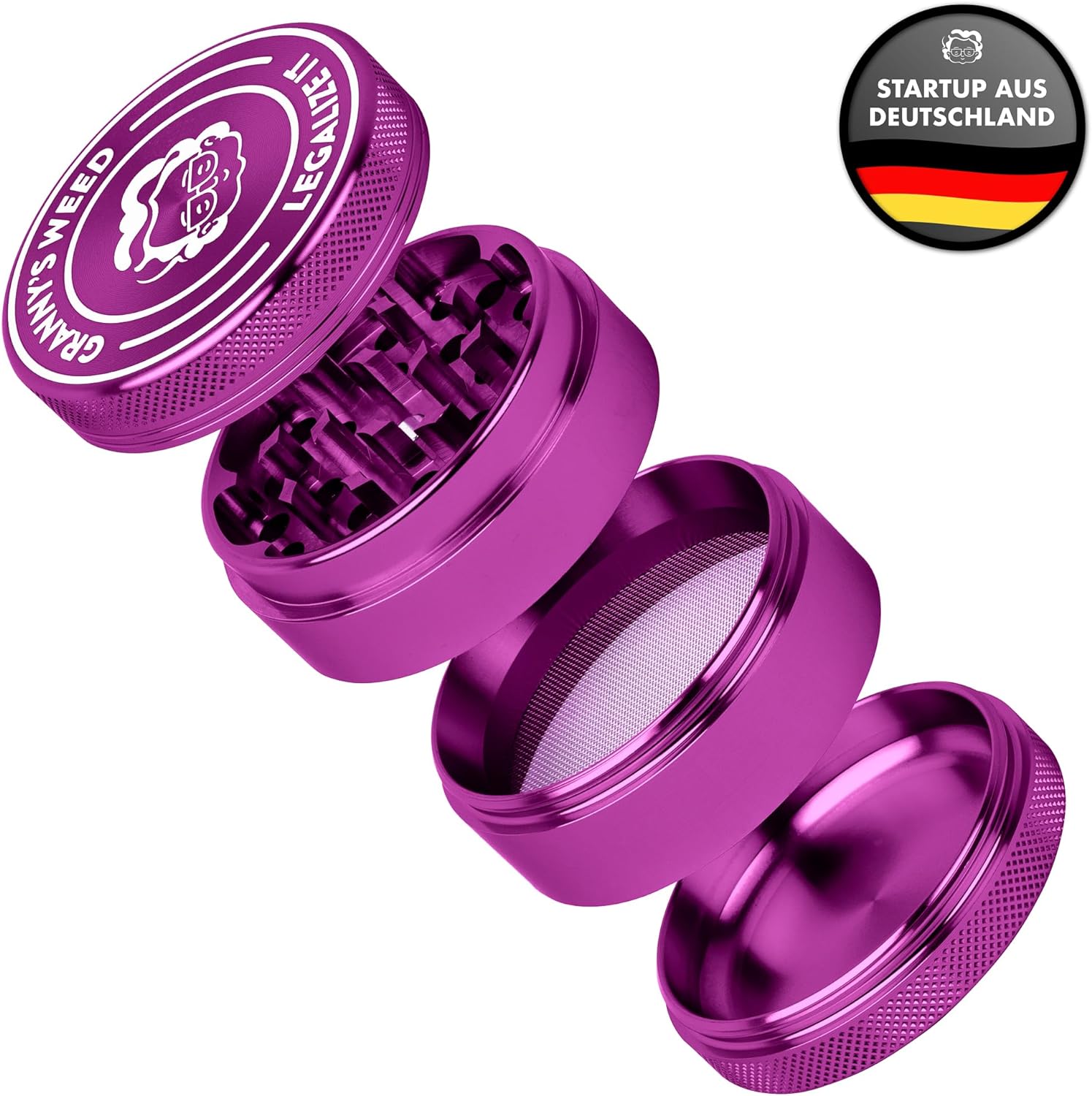 "Erlebe erstklassige Qualität mit Granny's Premium Aluminium Grinder: Ein messerscharfes Mahlwerk für ein perfektes Grind-Erlebnis. Mit einem Durchmesser von 5,5 cm und 4-teiligem Design, inklusive praktischem Pollenschieber. Verfügbar in edlem Gold und weiteren ansprechenden Designs." Präzision, Langlebigkeit und Effizienz vereinen sich in unserer GRANNY'S Kräutermühle, deinem perfekten Begleiter für den Alltag. Durch präzise gefertigte Mahlzähne und die optimale Lochgröße wird dein Kräutergrind in kürzester Zeit perfekt gemahlen, ohne zu verklumpen. Unser Grinder besteht aus hochwertigem Aluminium, das im sorgfältigen CNC-Drehverfahren gefräst wird. Mit liebevoller Handwerkskunst hergestellt und verpackt, überzeugt er durch seine Langlebigkeit und Robustheit. Die starke Magnetkraft sorgt zudem für eine nahtlose Verbindung zwischen den einzelnen Teilen. Durch die ideale Kombination aus angeschrägtem Pollenfilter und abgerundetem Pollenfach ersparen wir dir mühsames Zusammenkratzen. Stattdessen garantieren wir ein einwandfreies Grind-Erlebnis, das dich an die Qualität aus GRANNY'S Küche erinnern wird. Erhältlich in einer Vielzahl von kräftigen Farbvarianten, ist unser Grinder nicht nur funktional, sondern auch ein echter Hingucker - besonders in unserem auffälligen Goldton. Im Lieferumfang enthalten ist unser GRANNY'S Grinder mit einem Durchmesser von 55 mm aus Aluminium sowie ein praktischer Pollenschieber.