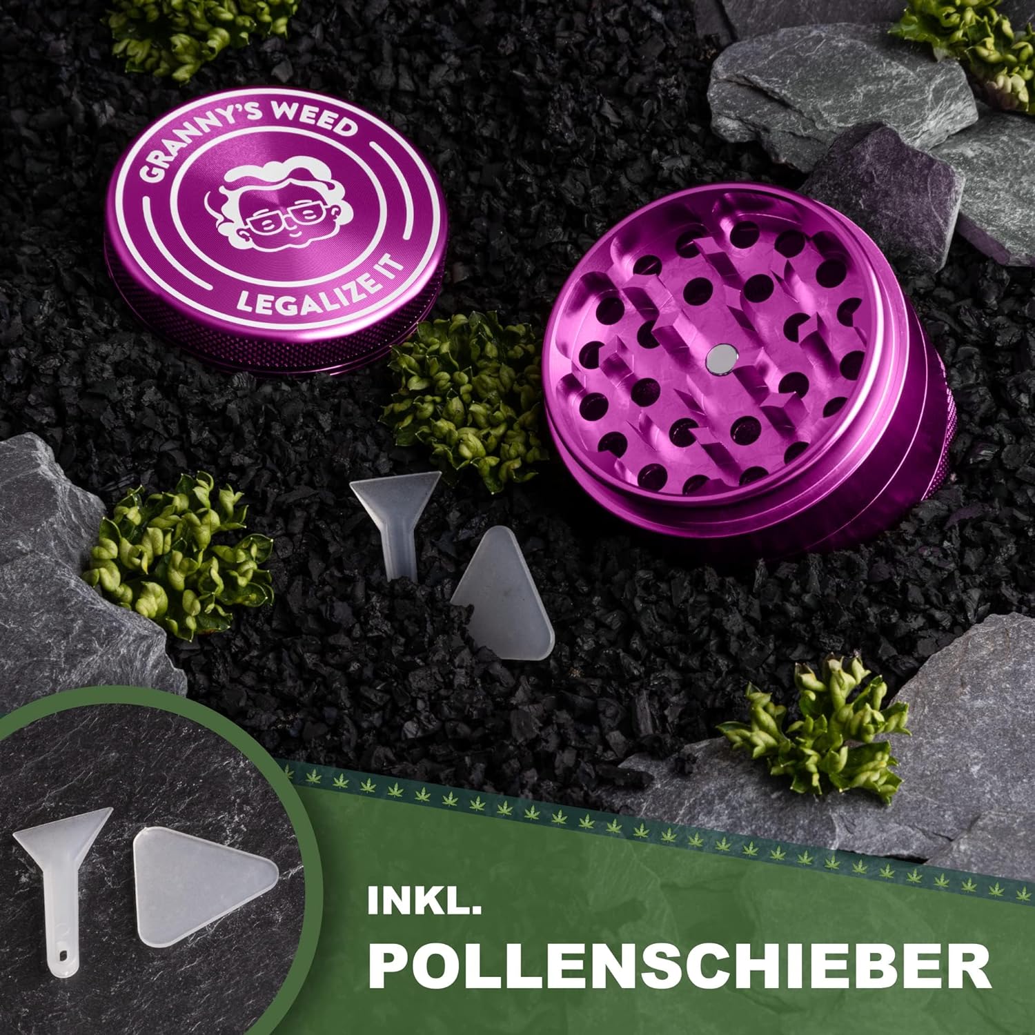 Im Lieferumfang enthalten ist unser GRANNY'S Grinder mit einem Durchmesser von 55 mm aus Aluminium sowie ein praktischer Pollenschieber.