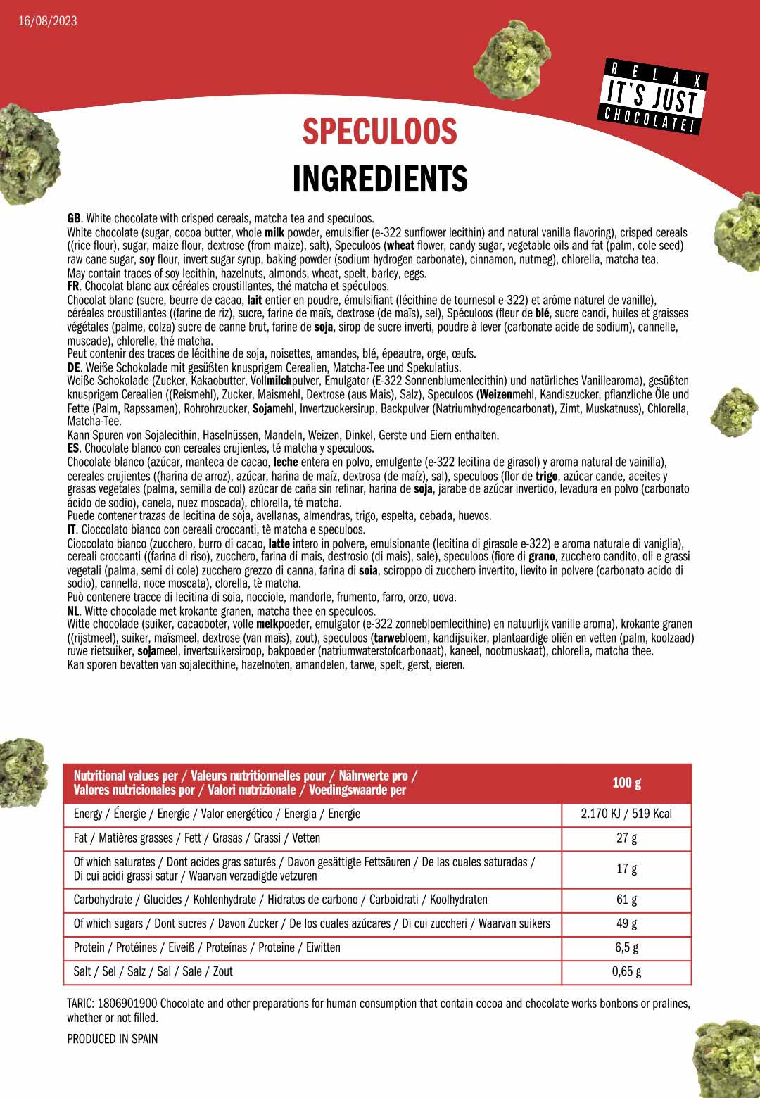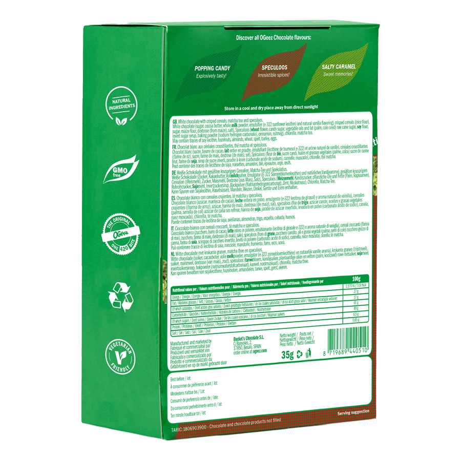 Tauchen Sie ein in die unwiderstehliche Fusion von zarter weißer Schokolade und knusprigem Puffreis, die mit einem Hauch von Matcha- und Chlorella-Tee sowie köstlichen Spekulatius-Keksstreuseln verfeinert ist. Diese einzigartige Kreation bietet ein Geschmackserlebnis, das alle Sinne verführt und begeistert.