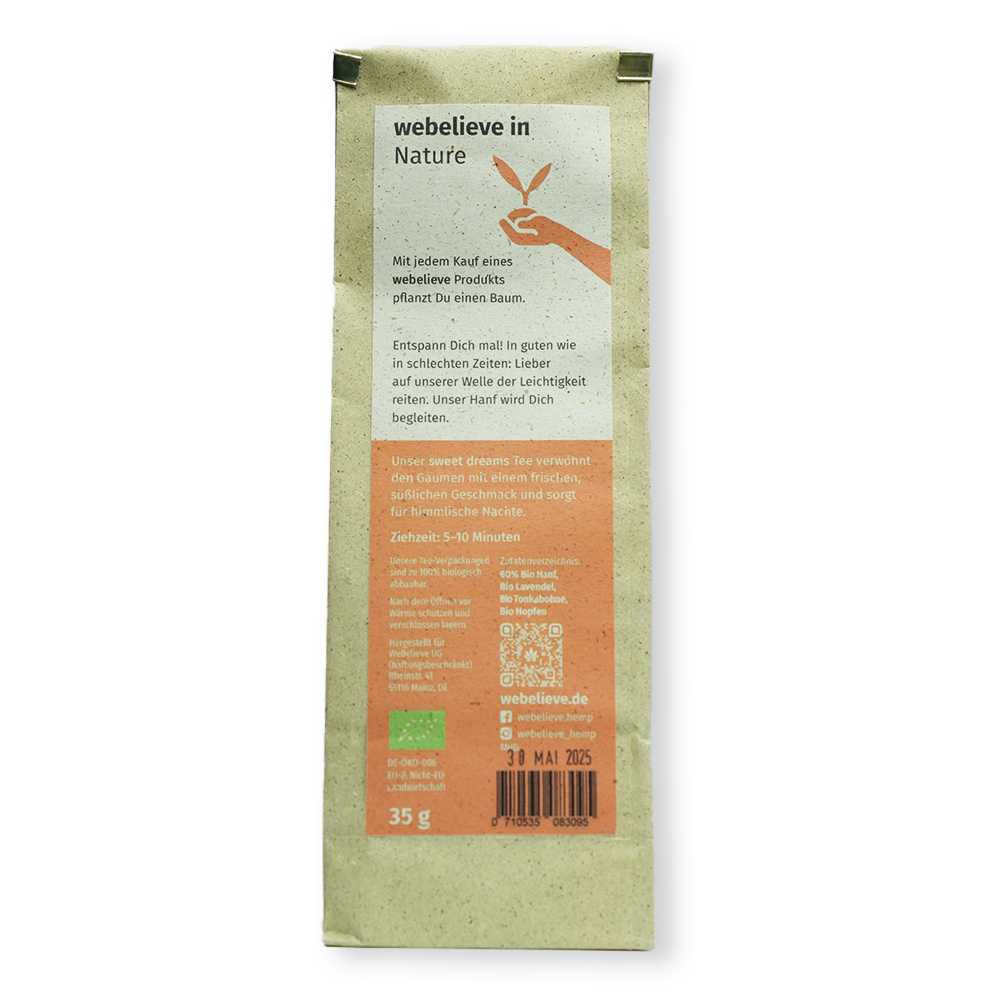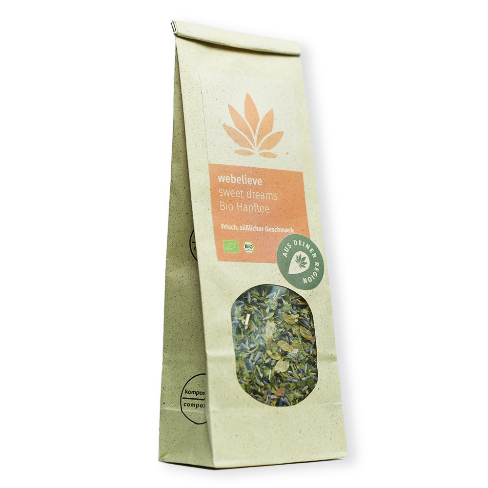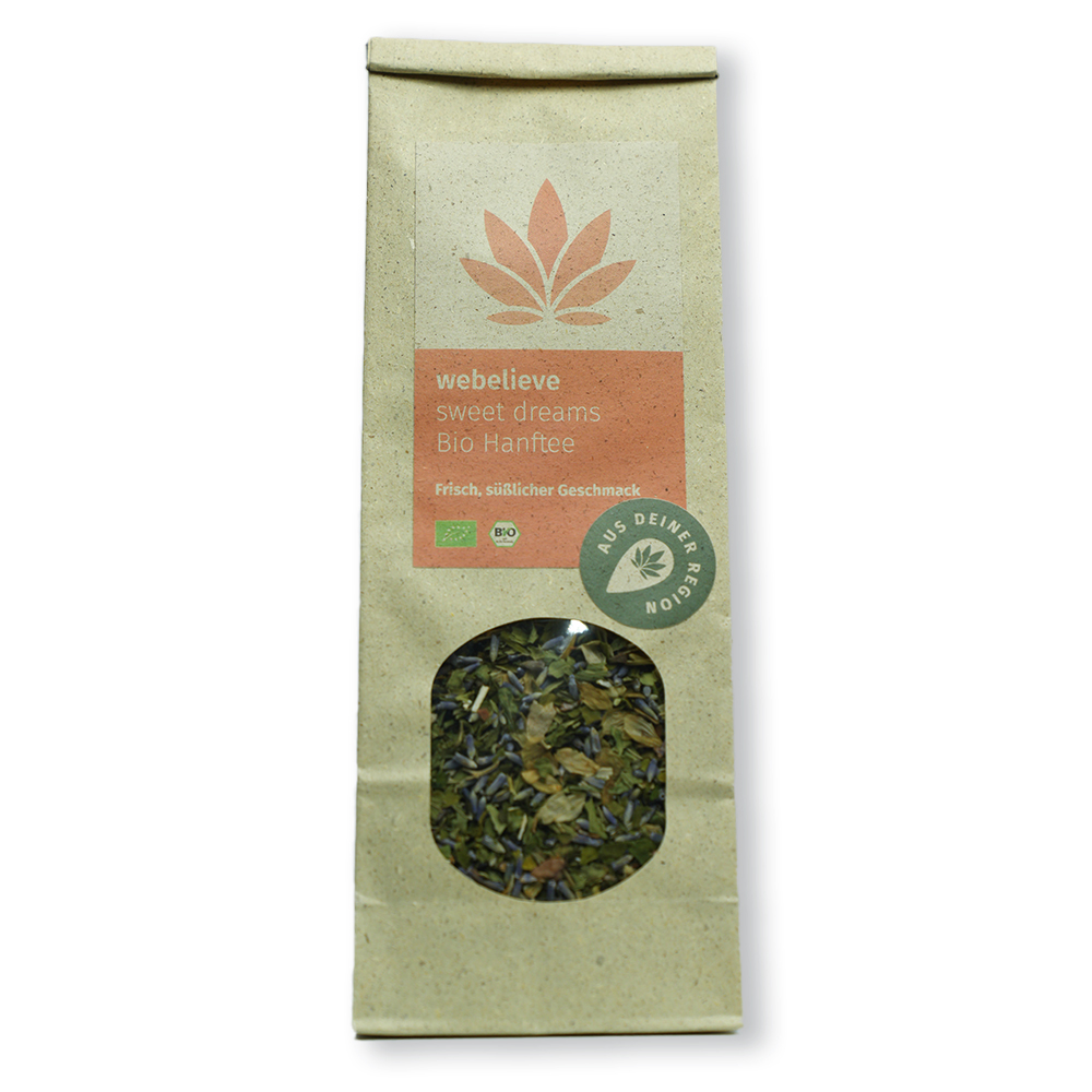 Unser CBD-Hanftee Sweet Dreams enthält Hanf, Hopfen, Lavendel und Tonkabohne in einer aromatischen, ausgewogenen Mischung.