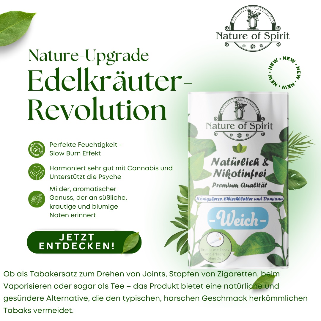 Entdecken Sie eine sanfte und natürliche Alternative zum herkömmlichen Tabak mit Nature of Spirit 1g Soft. Diese ausgewogene Mischung aus Königskerze und Damiana sorgt für ein angenehmes Raucherlebnis – ganz ohne Nikotin oder Teer. Perfekt zum Drehen, Stopfen, Vaporisieren oder sogar als wohltuender Kräutertee geeignet.